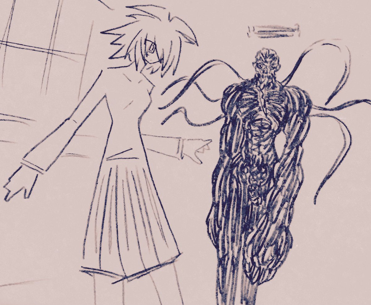 #無名絵師 #イラスト好きさんと繋がりたい #絵描きさんと繋がりたい #落書き こいつは昨日描いた落書き 学校の廊下でやべーやつと遭遇するというシチュをやりたかったが 画力が雑魚すぎて惨敗 怪人のビジュアルは結構気に入ってる