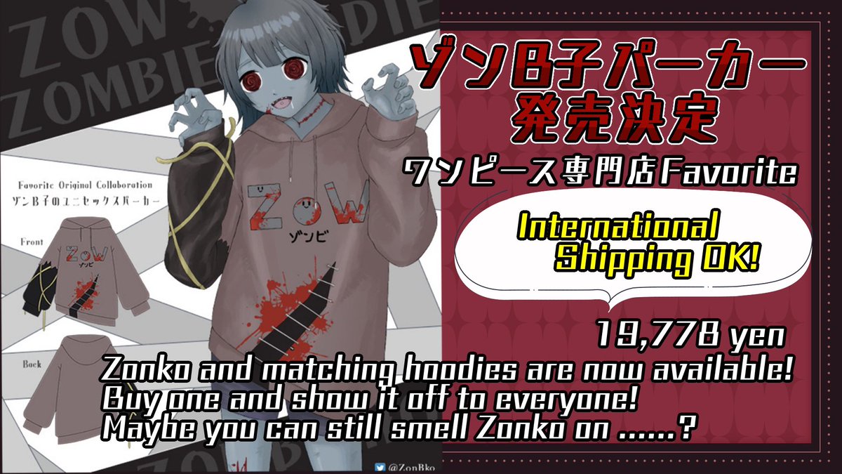 ゾンB子が着ているパーカーが商品化⁉️ Favorite(@Favorite_Onepi)とコラボ決定! 世界一可愛いゾン子のパーカーを購入できるチャンスだよ! こちらは一定数のご予約で生産決定しますので…気になる方は是非ぜひ予約して頂けると嬉しいです! (臭いはついてないよごめん) favorite-one.co.jp/view/item/0000…