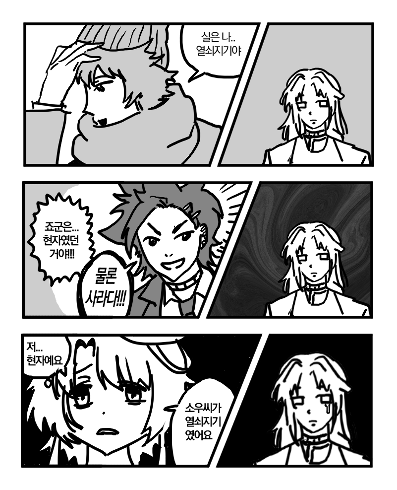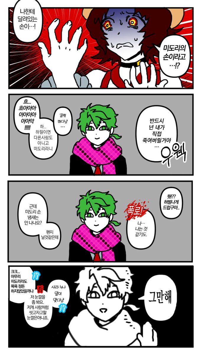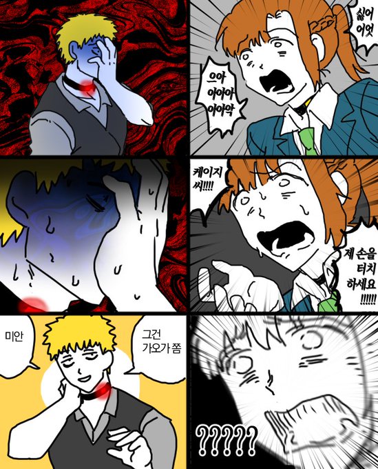 하근데 네가죽어 2장 초반 카이 보고 충격먹음............. 스토커남인줄알았는데 얼굴가린답시고 후라이팬으로 냅다 얼굴가리는 모에속성주부남이었던거임.........................