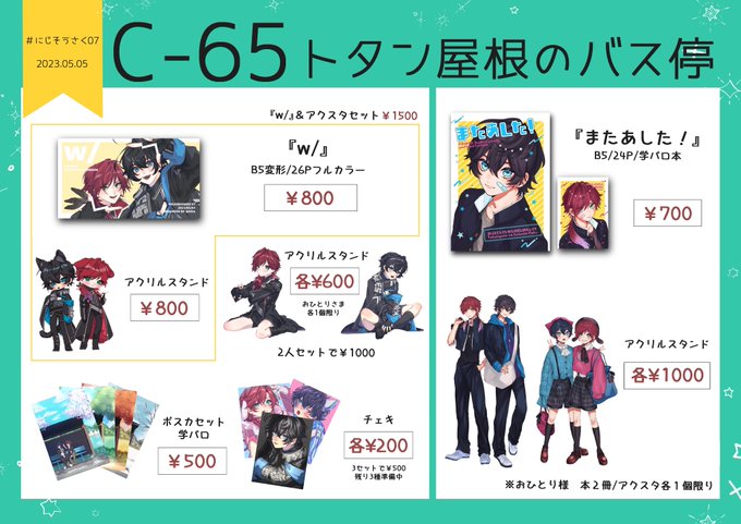 15 42 #にじそうさく07 【C-65】トタン屋根のバス停 お品書きです️✒️ シバ @_4shivava__ ろく @6do4k 当日は会場30分ほど席を外しております。 できる限りお釣りの出ないようご協力お願い致します🥲 売り子さんには黒崎えまちゃん @kuroma_cos_ にお願いしました☀️ 当日はよろしくお願い致します🫧 23/05/04 04:37