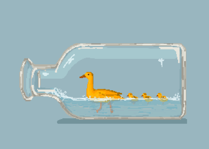Fast #TrappedInABottle duck and the ducklings. What have they forgotten there? 🤔🦆 For @Pixel_Dailies #pixel_dailies #ドット絵 #digitalart #pixelartist #cute #pixel #art #pixelart