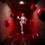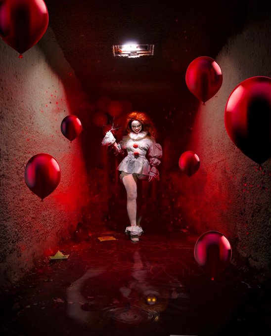 “I’m Pennywise the dancing clown!”🎈 Edit: Me 📸: @TaylorDawn199 Georgie: @BenkroTV #pennywise @Billskarsgard_ @StephenKing #cosplay #clown