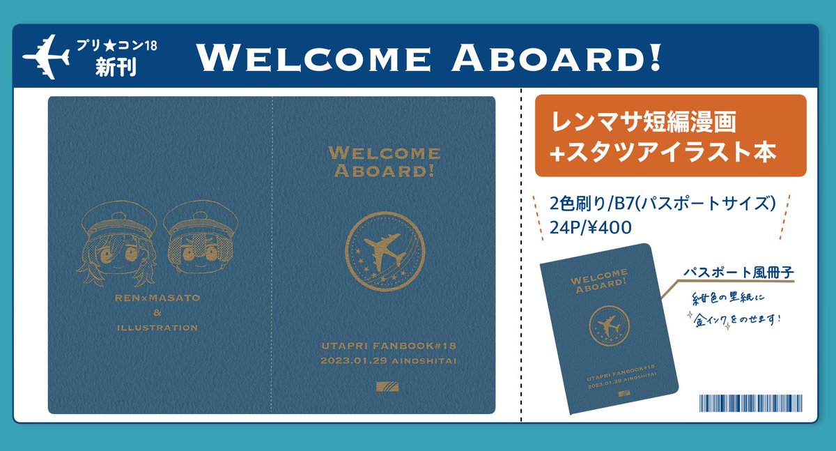 【プリ★コン18新刊】Welcome Aboard! レンマサ短編漫画+スタツアイラスト集 サンプルです!パスポートにまつわる漫画とイラスト 本文二色刷り、表紙金インク、パスポートサイズの本です✈️ 通販、お品書きはまた改めてあげます〜! pixiv.net/artworks/10473…