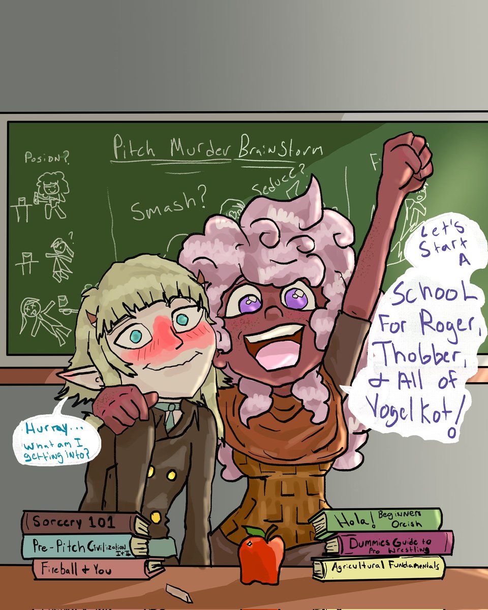 Little #comic I did of that time my #oc Eyldi and @LeilaBelleArt 's oc Aelix founded a school for our fellow party member @diegoescala 's Roger upon discovering he was actually just a dead kid in a big scary golem body. #dndart #digitalart #dnd5e #dndcharacters