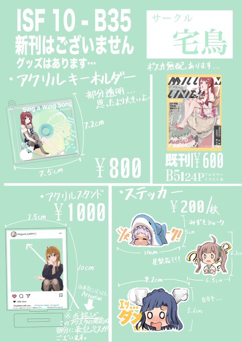 お待たせしました…ISFのお品書きです… ポストカードなど無料で配りますので…いらしてくれると嬉しいです… また、グッズのサンプルをリプ欄に置いときますのでぜひ参考にしてください 注:グッズの一部に誤字があります…誠に申し訳ありません…数を絞って頒布させていただきます。 #ISF10