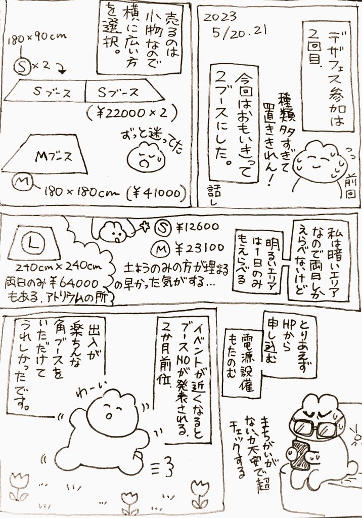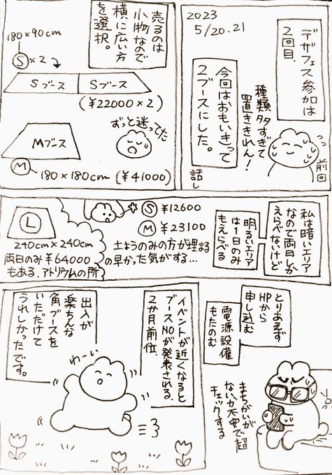 4 16 デザフェス57申込みメモ日記…(1/2) デザフェス出展してみたいって方をちらほら見かけたので、私の今回の流れと具体的にどれくらい費用がかかったのかまとめてみました🪻 ちょ〜私目線の落書き漫画なんだけど、少しでも参考になってあの最高に楽しい空間を共有できるといいな、暇な時読んでみてね 23/05/22 17:02