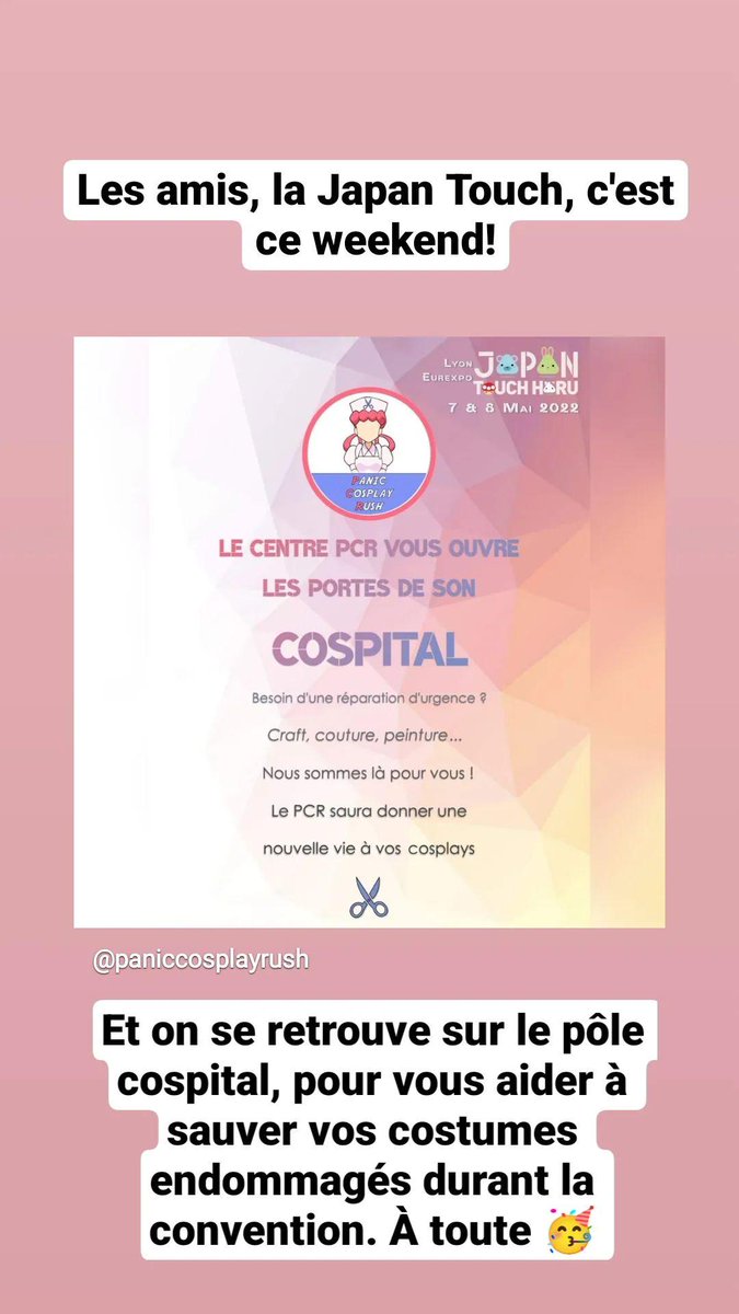 Hey Les amis! Ce weekend c'est la Japan Touch sur Lyon. On peut se croiser au pôle Cospital du PCR, passez faire un coucou même si vous n'avez pas de #Cosplay cassé 🥳 #Convention #JapanTouch #Lyon