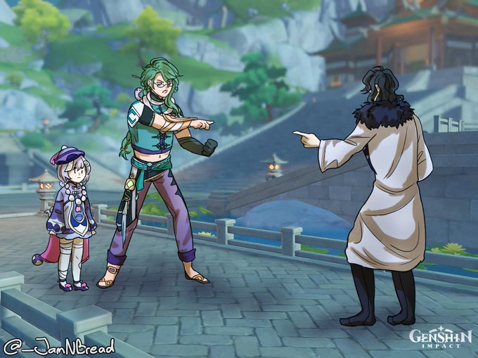 🤔 sometime somewhere in between bubu pharmacy and northland bank... ik this joke is overused but i realized theyr actually a lot closer to meeting than we might think, this is my rendition of that moment #原神 #genshinimpact #genshinimpactfanart #qiqi #Baizhu #Pantalone #artph