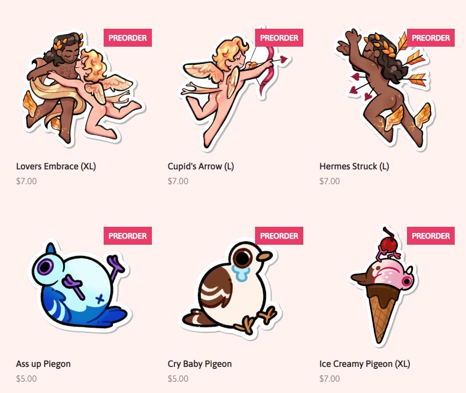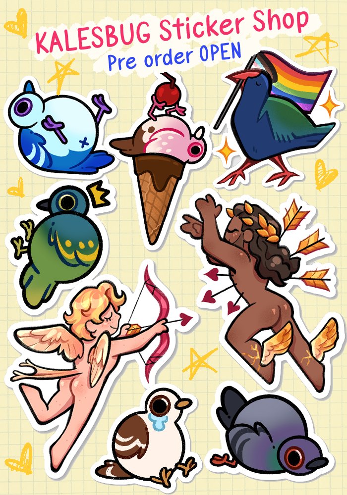 STICKER SHOP REOPENING~! ✨🫰💗💘 Featuring: Pigeon Sticker Collection on Matte Vinyl Cupid + Hermes Arrows Collection on Glossy Vinyl! Open for Pre-orders ! kalesbug.storenvy.com