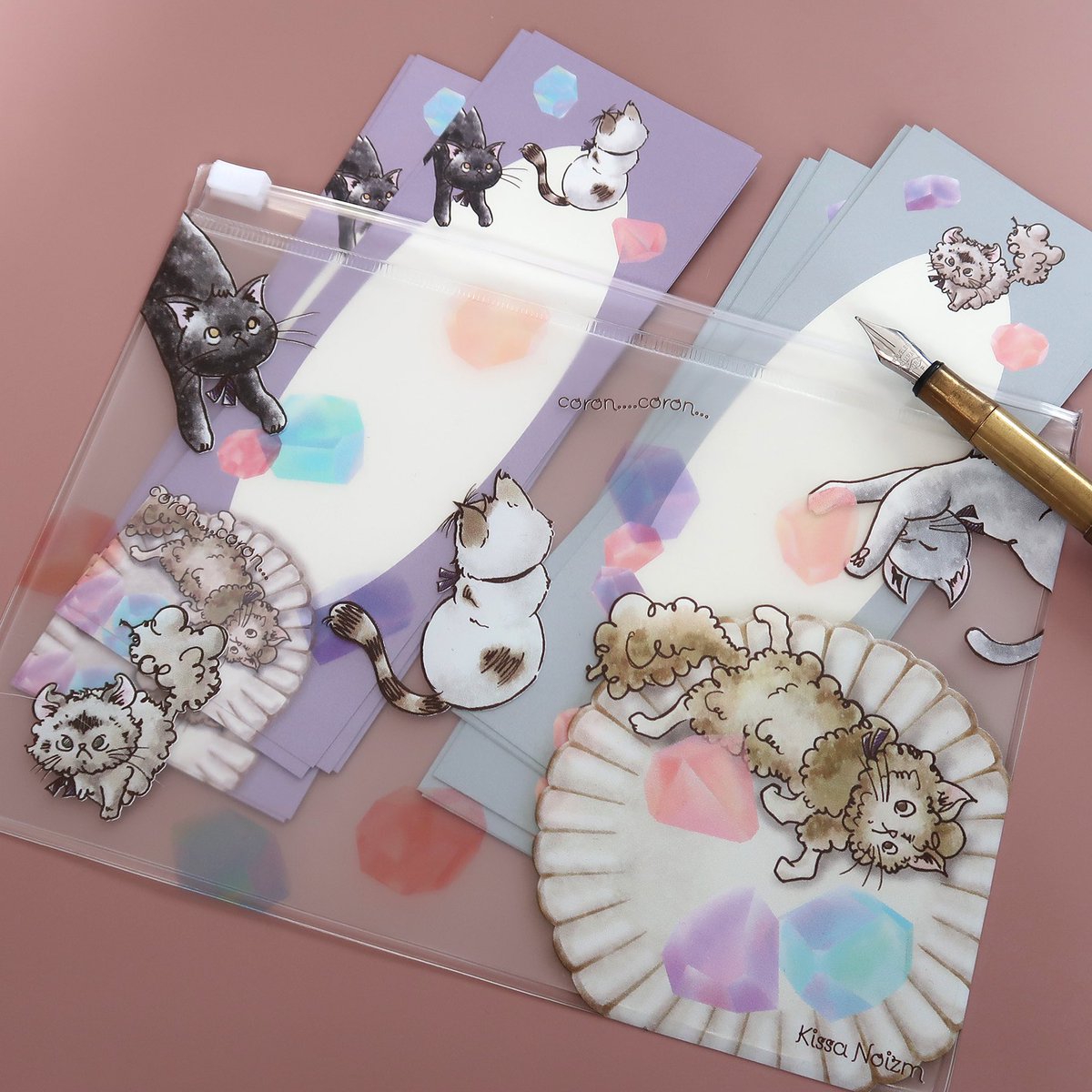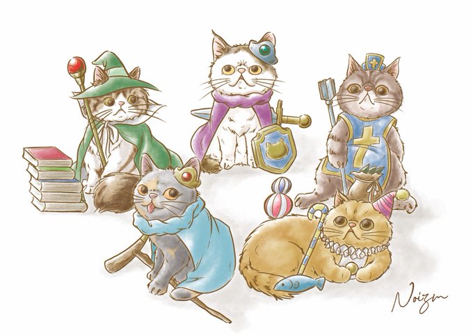 オーダーで 飼い猫ちゃんを描かせていただきました 衣装やポーズなどご希望をお聞きして楽しく描きました^ - ^ かわいいにゃんこ達がバッグやポーチをチェックしてくれてて…とても嬉しいな twitter.com/nekotakaran157…