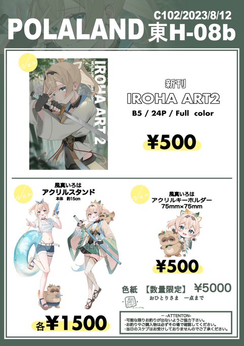夏コミ おしながき🐕 #C102 8月12日 1日目 POLALAND 場所 ▶︎ 東H-08b 新刊、いろはちゃんアクスタ2種、いろぽこアクキーです。 ※アクキーの通販予定はありません。 よろしくお願いしますー!✊