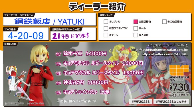 7/30 ワンダーフェスティバル2023夏に「鋼鉄飯店」は出ますよ。4-20-09です。 錦木千束 (リコリス・リコイル) キュアミラクル キュアマジカル のルビースタイル キュアトゥインクル[展示] 神楽ひかり(少女☆歌劇レヴュースタァライト) すべて未塗装・組み立てキットです #WF2023S #WF2023Sおしながき