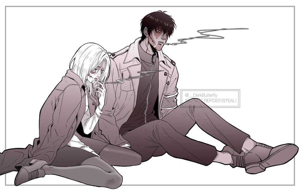 Annie and Bertholdt if he had survived and returned with her to Marly. I headcanon them both smoking and being dead inside🥺 I also drew a scar on Berto's neck that Mikasa inflicted on him when she pierced her sword through his neck. Thought it would look cool!