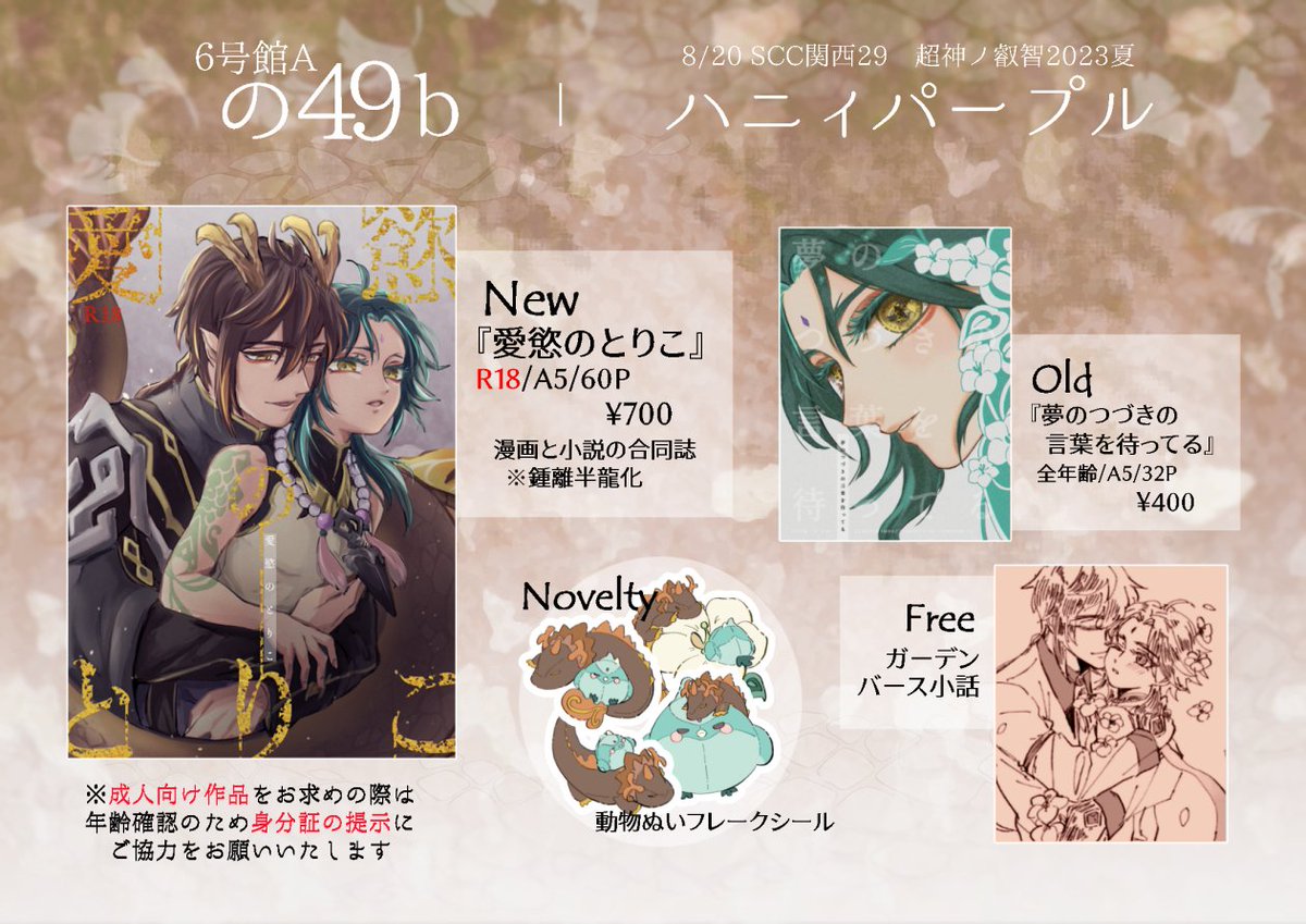 SCC関西29の叡智お品書きです 全部鍾魈です~よろしくお願いします サンプル↓ 新刊『愛慾のとりこ』→pixiv.net/artworks/11092… 既刊『夢のつづきの言葉を待ってる』→pixiv.net/artworks/10945… 6月の無配とシール追加で作ったので持っていきます~よかったらもらってください!新刊通販申請中です! twitter.com/__Hpa4/status/…