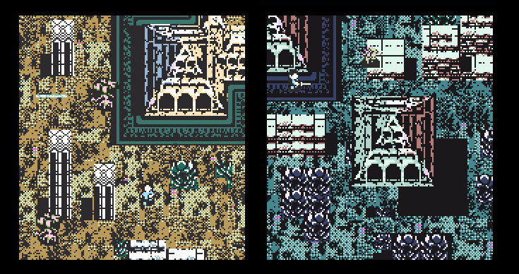 Mockups of some village ruins. I'll probably add in a lake or pond with a bridge. #pixelart #ドット絵