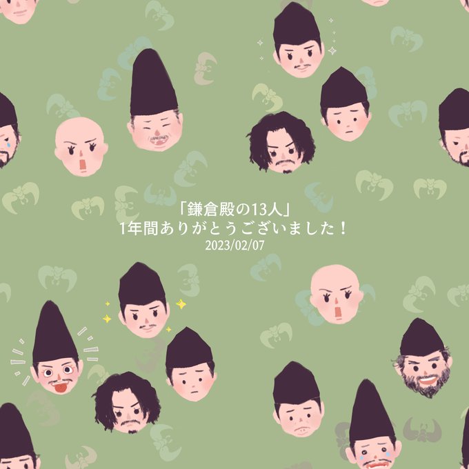 30 178 最後に「鎌倉殿の13人」を描きました(シームレス加工で見切れてるけど全員いる) 「新選組!」「真田丸」に続いて1年間楽しい日曜夜を過ごせました いつかまた三谷さんが大河ドラマを手がけるのを楽しみに待っています! #鎌倉殿の13人 #殿絵 #鎌倉絵 23/02/07 00:00