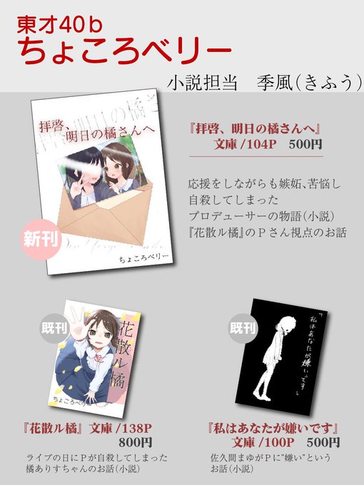 8 7 明日(今日)のお品書きです! 東棟に来られる方でお時間ありましたら是非…!【東オ40b】におります! デレステの小説、漫画、FGOのイラスト本などあります!! #C99 21/12/31 01:29