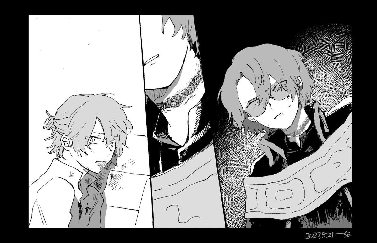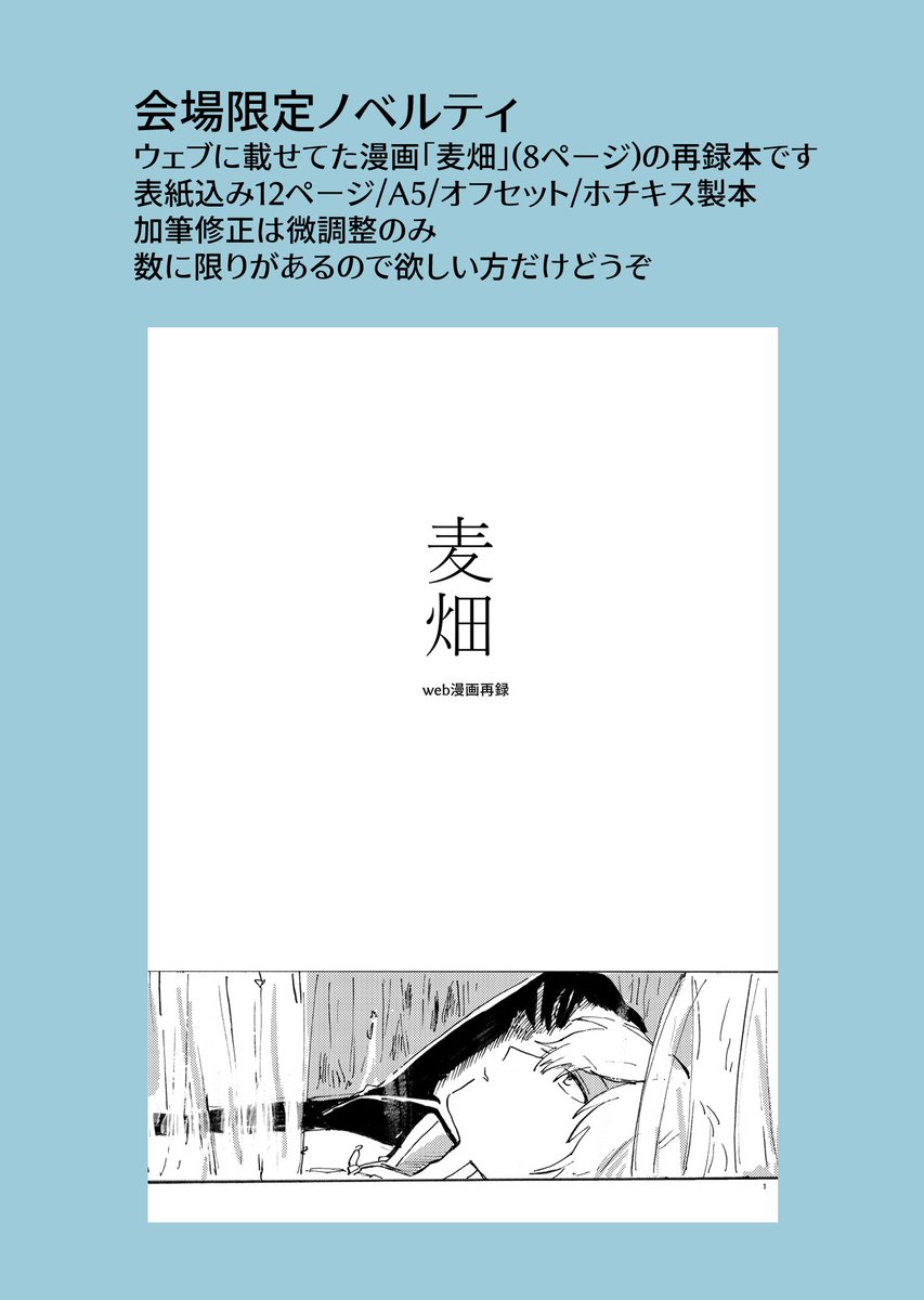 表紙&本文サンプル② 新刊長めのサンプルpixiv.net/artworks/10623… 会場限定ノベルティ「麦畑」 12ページ/A5/ホチキス本 webに載せていた漫画「麦畑」(8ページ)の再録です 加筆修正は微調整のみ 数に限りがあるので欲しい人だけどうぞ