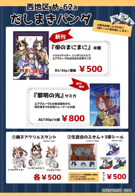 【#C101 お品書き】 冬コミのお品書きです🐴🥕 12/30(金)西め-62a「だしまきパンダ」 本やらグッズやら色々あります! 当日はよろしくお願いします! 🍈→melonbooks.co.jp/detail/detail.…