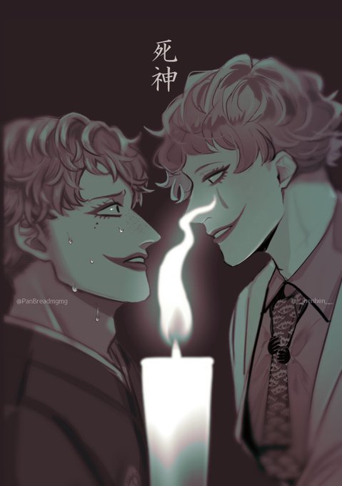 大好きフォロワー( #PanBreadmgmg )と合作しました!ありがとうパンねき! 『死神』 左🤡・ラフ案・仕上げ▶︎パン仔 右🤡▶︎タシカヨウ 『目を閉じておいでよ』 👨🌾▶︎パン仔 🤡・ラフ案・仕上げ▶︎タシカヨウ