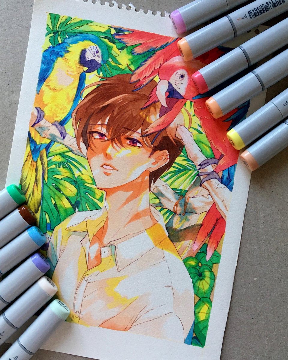 ♡rtありがとうございました🦜🌿☀️ 熱帯にいるひろしでした。 12色縛り。コピックと一緒の画像で夜上げです。 コウゴウインコ、というか鳥を初めて描いた…🦜🦜🦜 #コピック