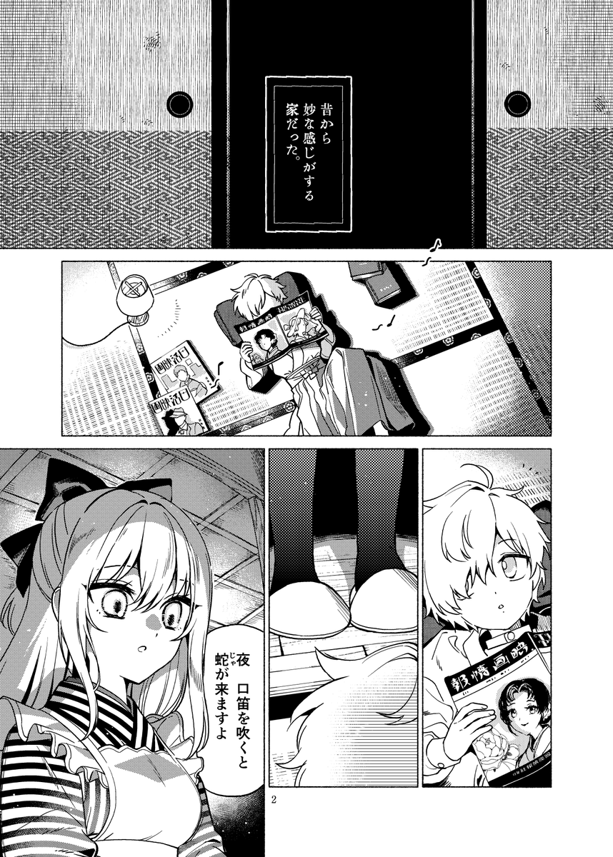 pixivに本文見本何枚かアップしました。 サクッと読める短編シリーズとしては2作目。大した量ではないですがオマケページもあるので前回より本文が4ページ多いです。楽しんでいただけますように pixiv.net/artworks/11126… #怪異事件帖ひゅうどろ 番外編『嘘嘘嘘嘘』来月3日発行です tttwitter.com/_HYU_DORO/stat…
