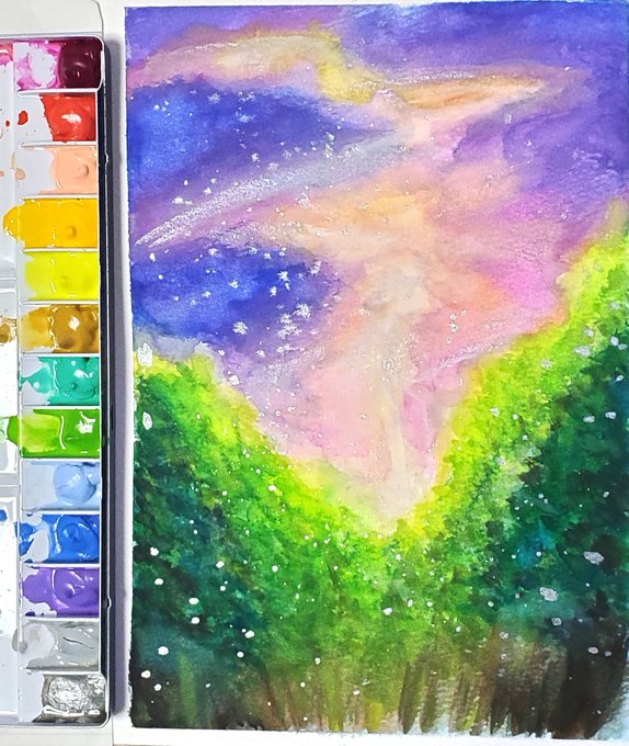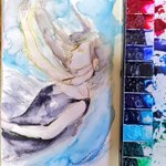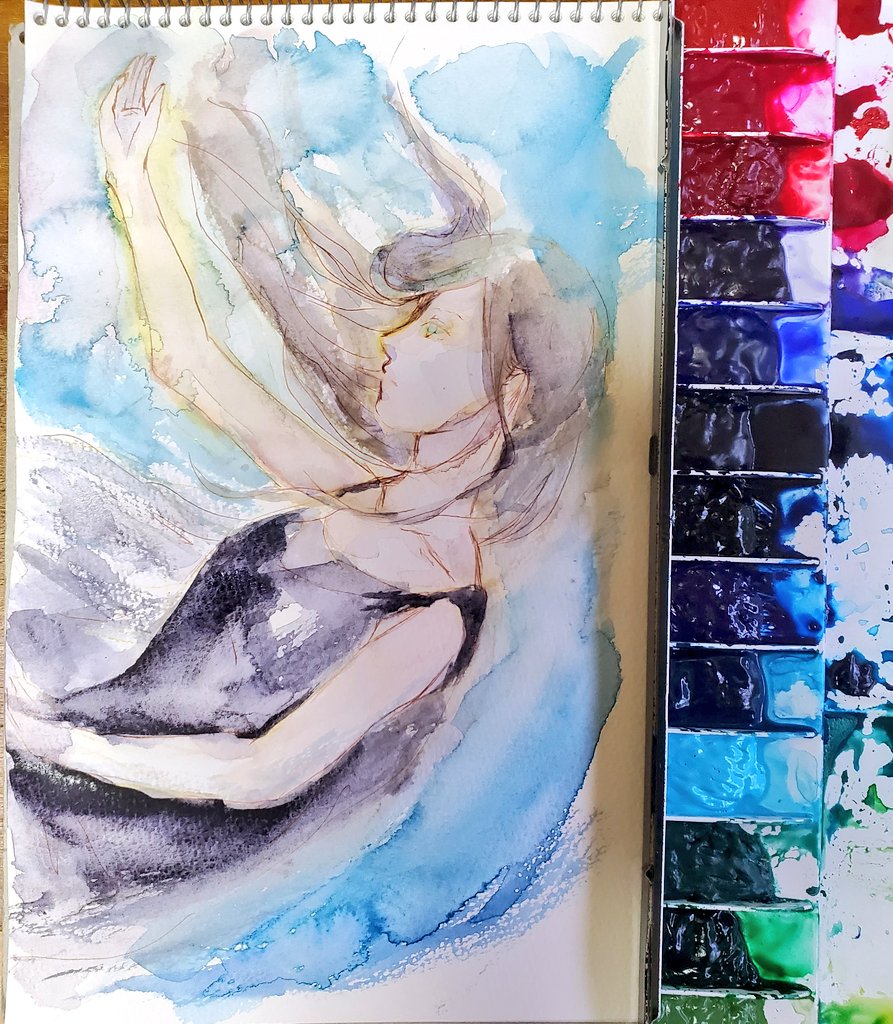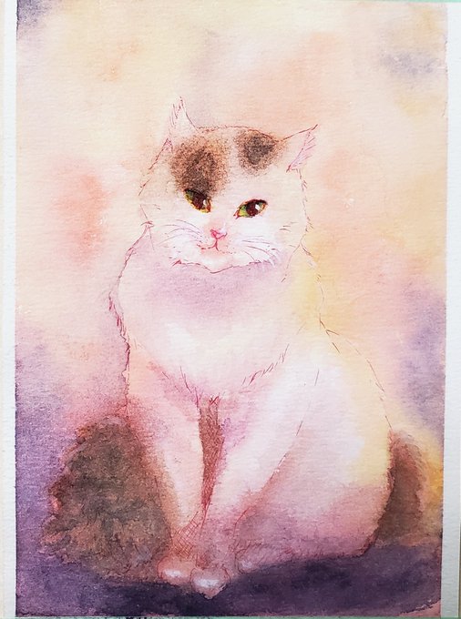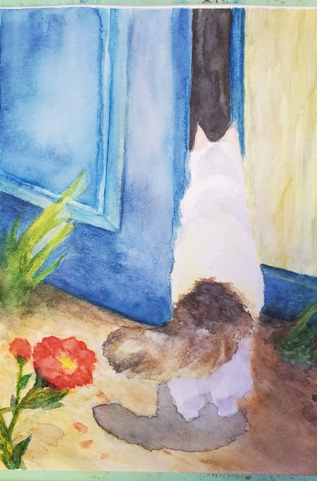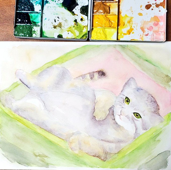 4日目、雨だれ #水彩強化マラソン2022春 #水彩日和 #猫 #watercolor #アルティスティコ マリンブルーとマヤバイオレット中心🎨 パレット新調のため掃除もかねて。ほんの少しの絵の具で充分使えるからなかなか移行できない!