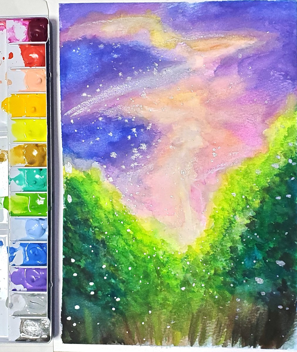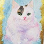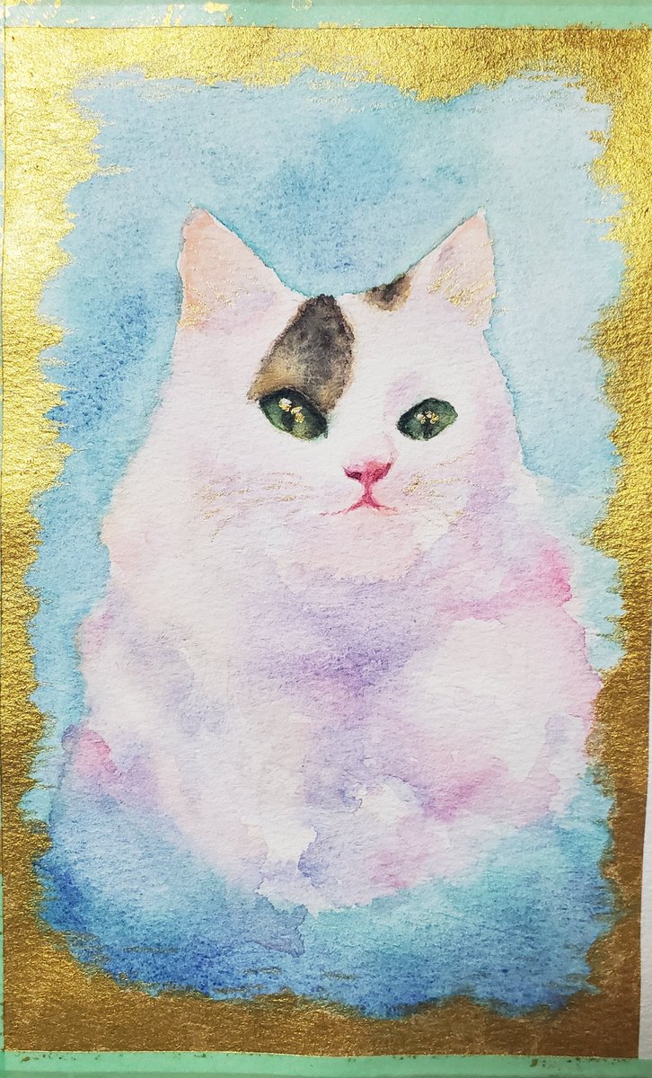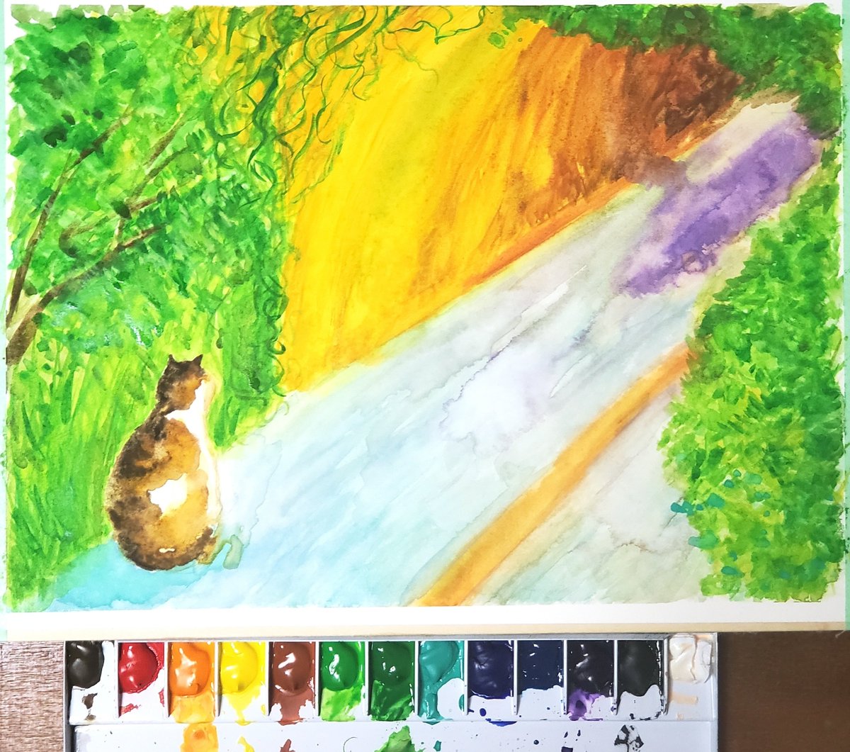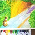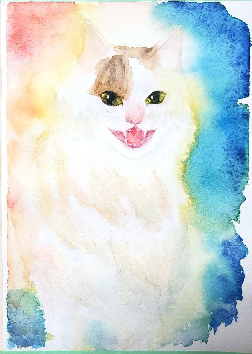 11 風の向くまま☘️ #水彩強化マラソン2022春 #水彩日和 #猫 #watercolor #ホワイトワトソン スパッタリングに挑戦してみました😺写真で色を再現するの難しい! ミントベリル(クサカベ)とシャドーグリーン中心🎨
