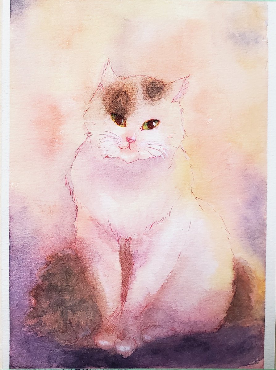 8 桃と猫🍑 #水彩強化マラソン2022春 #水彩日和 #猫 #watercolor #アルティスティコ 最後は白ペンと水彩色鉛筆に助けてもらっています🐱 まっちベーシックカラー+キナクリドンスカーレット中心🎨