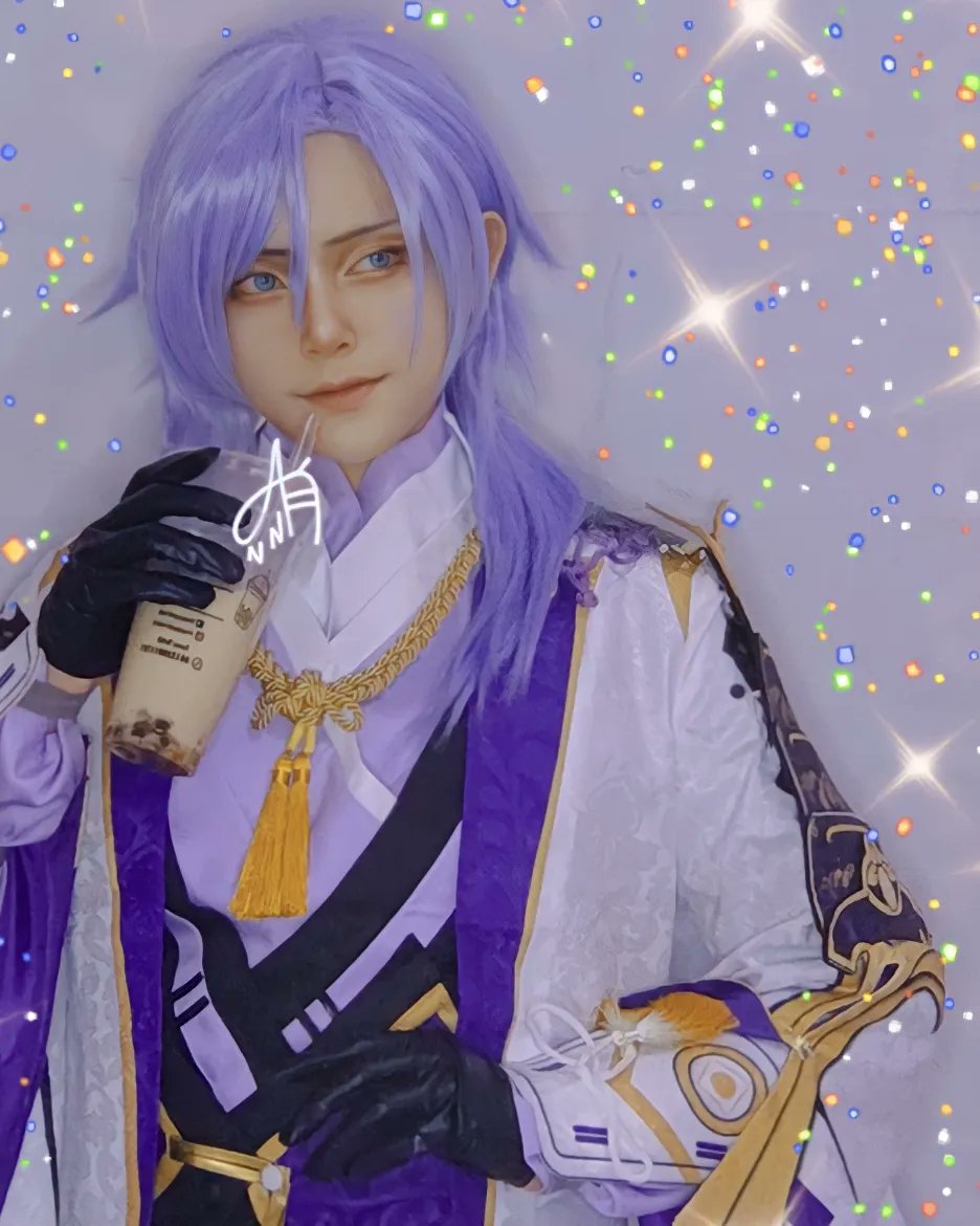 when you can bring #KamisatoAyato home but not his Haran Geppaku Futsu, so he drinks boba instead... . . . #cosplay #コスプレ #genshinimpact #原神