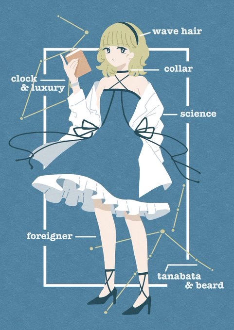 科学、時計、首輪、ひげ、髪の毛ウェーブ、七夕、高級品、外人 というお題で描きました!