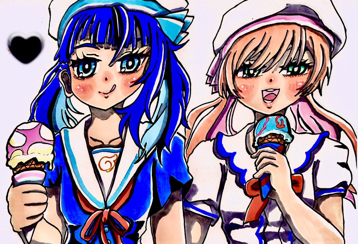 7/28のお題「ツインテール」より... ソラ・ハレワタール&虹ヶ丘ましろ(みわたせ!水平線) アイス食べてる2人でサマーなポップ感? 3連続ワンドロはきちーわ笑 休も。 #プリキュア版深夜の真剣お絵描き60分一本勝負