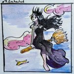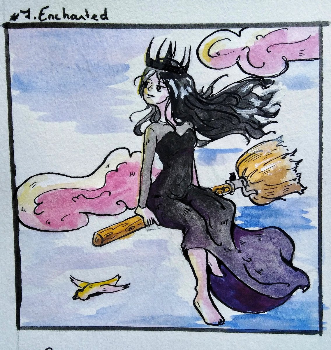 7-Enchanted Queen Dani on her broomstick, fan art from Hooky by @miriambonastre #inktober #inkchallenge #inktober2019 #ink #inktoberday7 #enchanted #hooky #hookywebtoon #hookyfanart #hookydani #hookyinktober2019 #witch #watercolor