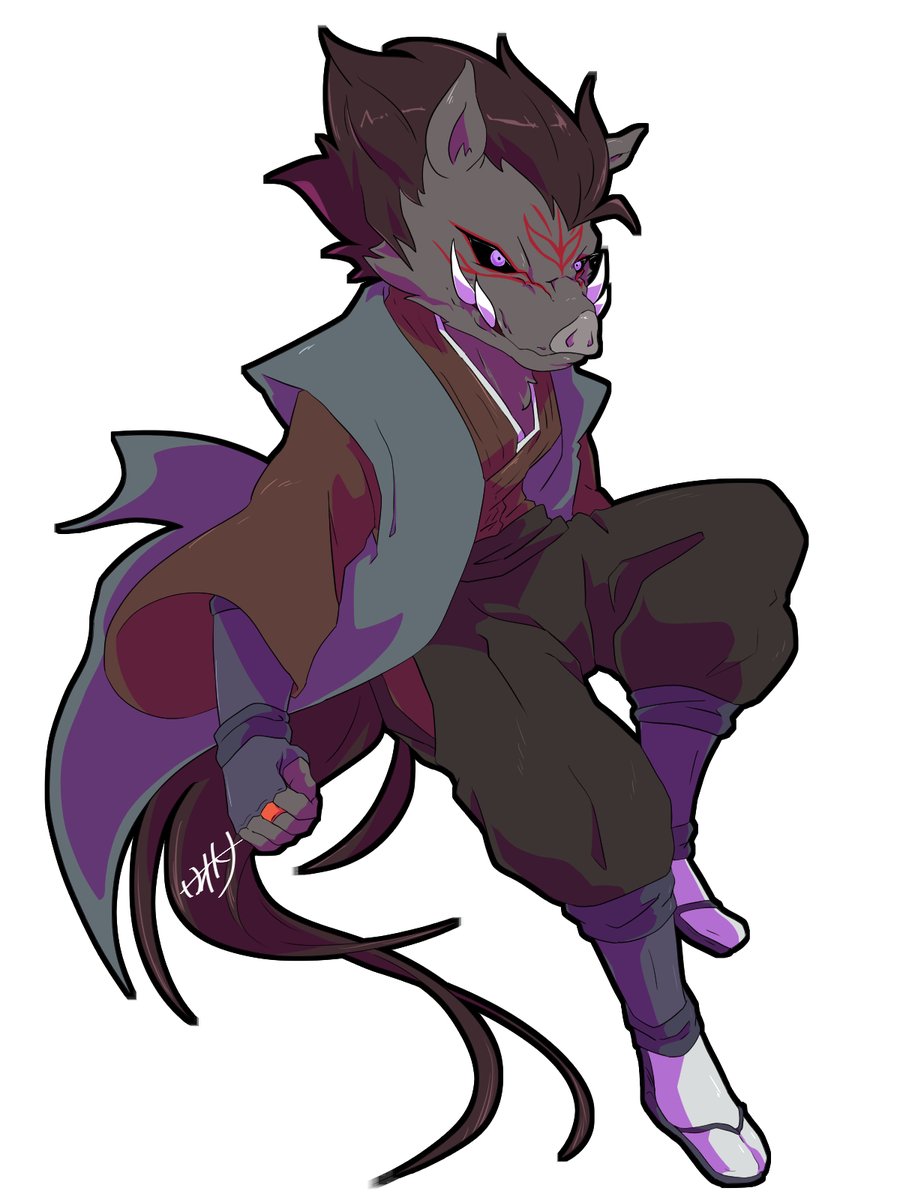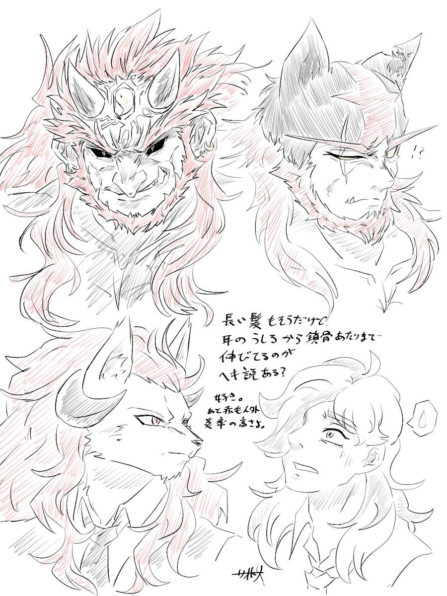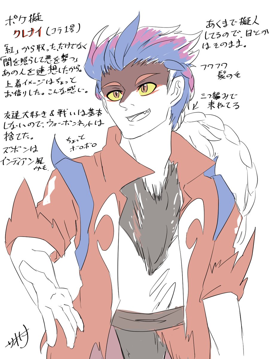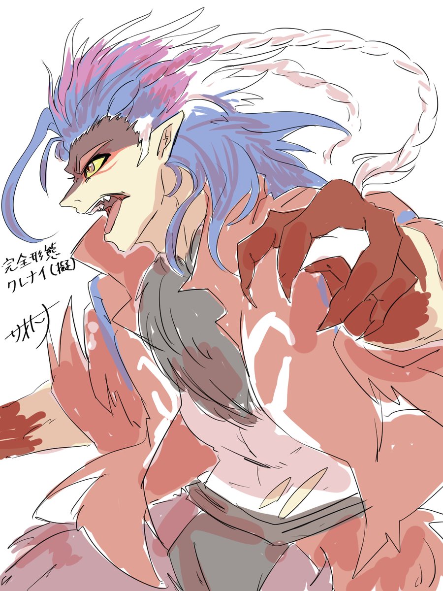 疑クレナイくんのバトルフォルムはこんな感じっていう落書きが出来た~~ 三つ編みで束ねてた髪が解けて逆立ってたり、口元と手だけ元に戻したりとかなんとか………耳のとんがりは完全趣味です(てか全部趣味による twitter.com/_boneguy1487/s…
