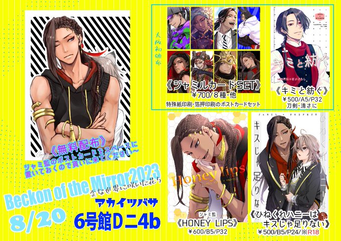 【サークル参加します!!】05月03日(東京)SUPER COMIC CITY 30-day1-内 超Beckon of the Mirror 2023| #イベントGO_赤ブー akaboo.jp/event/item/201… 5月申し込みました~! 延期してたジャミ監♀本(魔法薬で獣人になってる監)と、ジャミル単体のイラスト集他持っていく予定です☺️