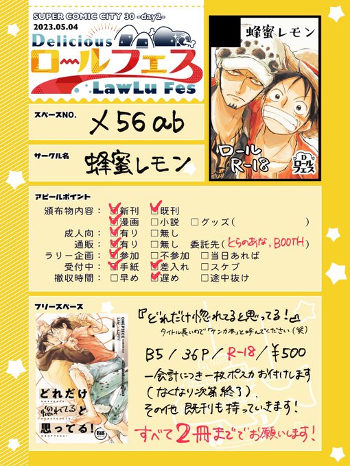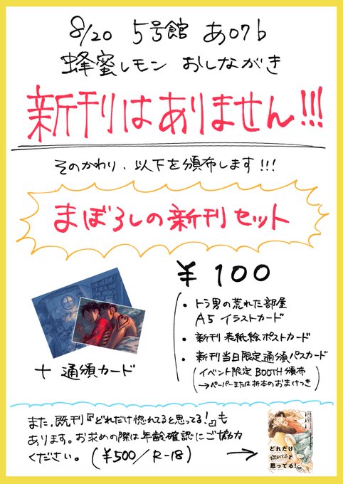 新刊の通販が思ったより早く完売したので、再販を希望される方がいましたら「再販希望」をポチッとしてもらえると嬉しいです。参考にします。 一応次回イベントのために残してる分は8/20の大阪インテで頒布予定です。 『どれだけ惚れてると思ってる!』とらのあな→ ec.toranoana.jp/joshi_r/ec/ite… #lawlu
