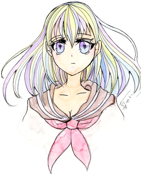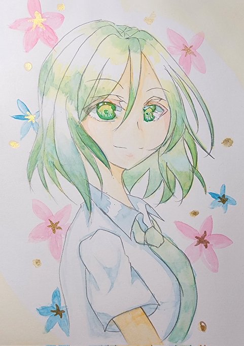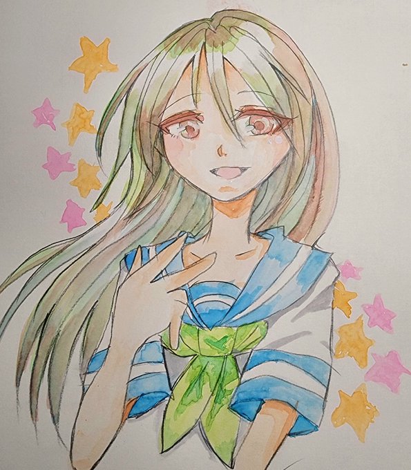 1 5 今日の1枚!髪の毛を黄、緑、茶の順番で塗ってみました❁⃘*.゚ #透明水彩 #アナログ絵 23/05/16 03:55