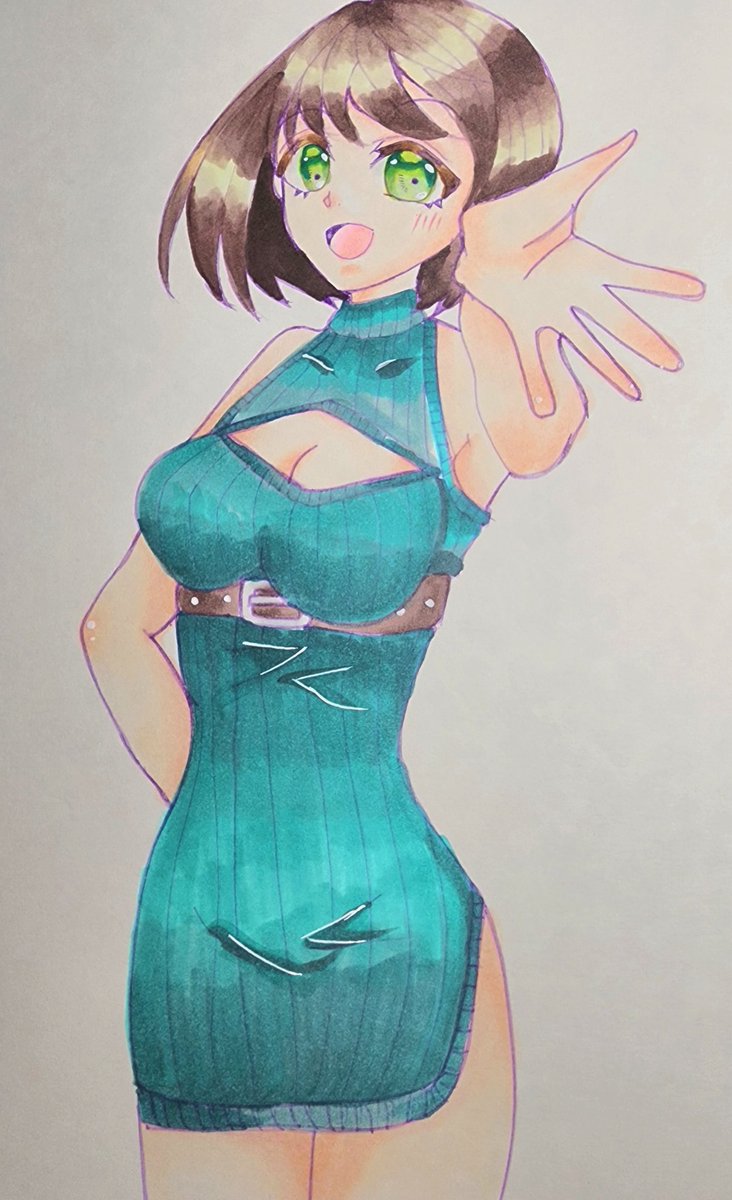 2 3 ここまで塗ったのはいいけど、背景全く考えてなかった😂リブニットの服って、なんかいいですよね…… #コピック #アナログ絵 23/06/01 04:36