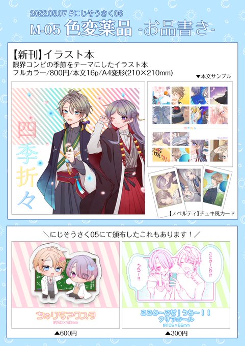 11 51 【 #にじそうさく06 お品書き】 5/7(土) 開催 にじそうさく06 "M-05" にてこちら頒布予定です! 限界コンビメインで当日はヴァ3Dおめでとうクソデカポスター掲げます🎊㊗ よろしくお願い致します〜🥳 22/05/02 21:20