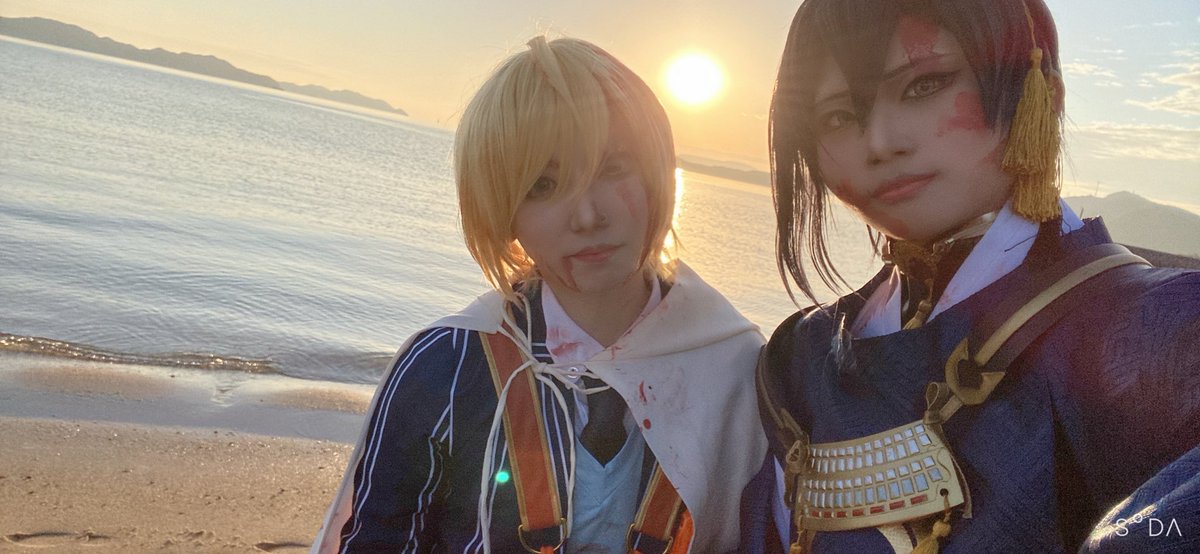 おそくほ‼︎ コス写真注意⚠️ 初期刀と初鍛刀と一緒にエモ撮影してきたよー ○年振りの三日月に血糊楽しかった☺️