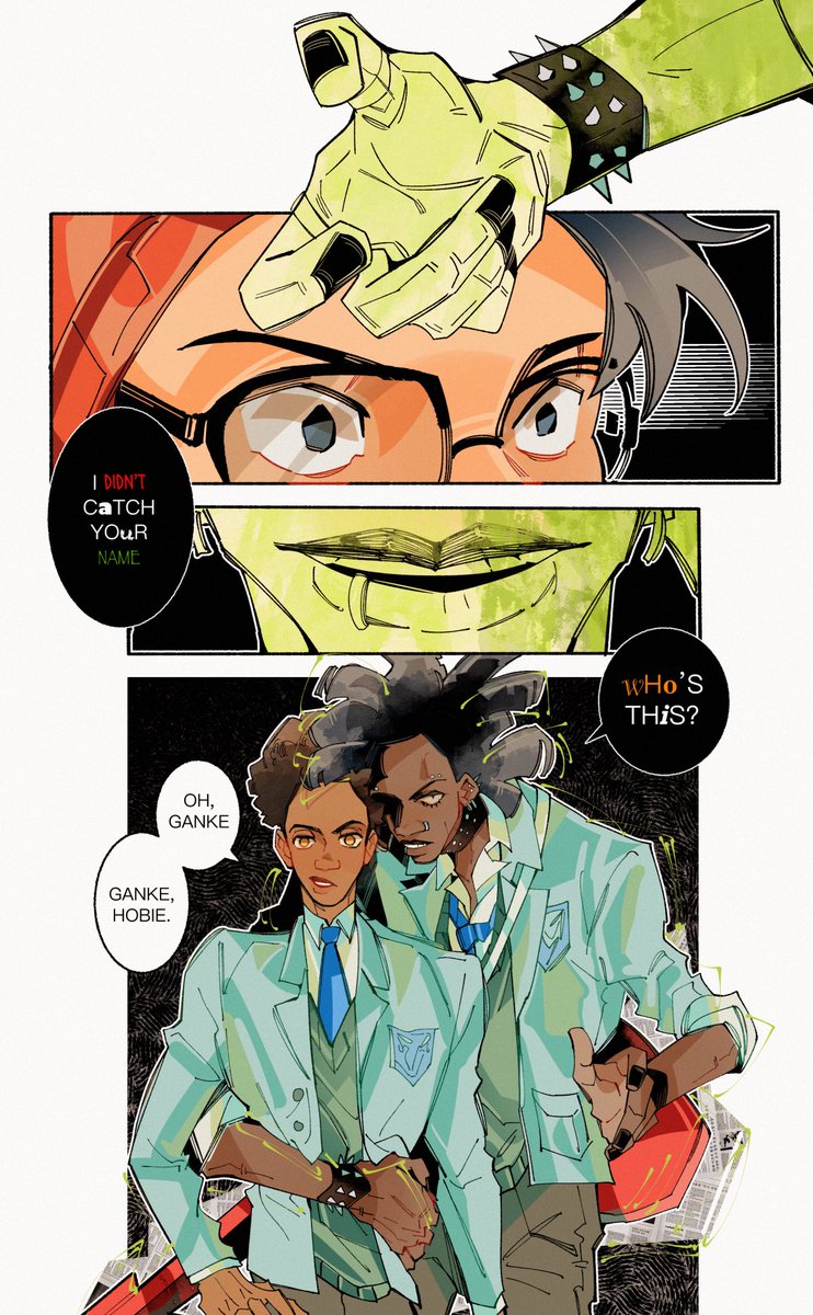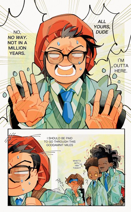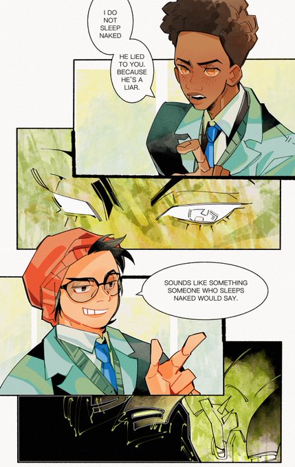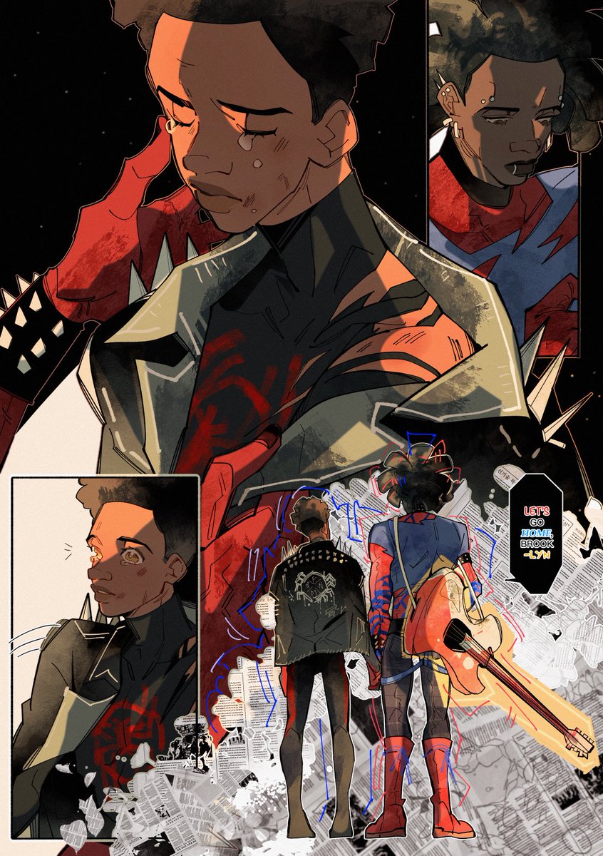 #PunkFlower drew my favourite scene from a fic called Mutualism by cruelzy ! 🌻 Hobie and Pav tried to sneak into Miles’ school, and poor Ganke gets dragged into his roommate’s love drama 😭 (1/2)