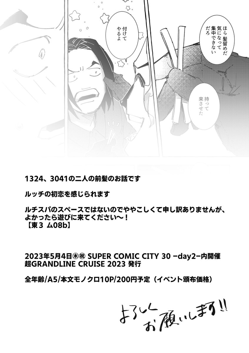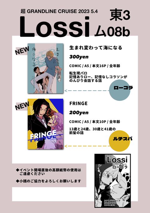 5/4 超GLC2023 東3 ム08b【Lossi】 お品書きです! ローコラのサークルなのになぜかルチスパ本もあります よろしくお願いします! ▼新刊サンプル ローコラ twitter.com/_ga_wa_/status… ルチスパ twitter.com/_ga_wa_/status…