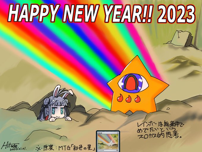 あけおめイラスト。 モチーフは見た時にネタにしたかった「彩色の星」+申し訳程度の干支要素。 今年もまったりよろしくデス_(:3」z)_ #お絵描き #HappyNewYear2023 #MTG