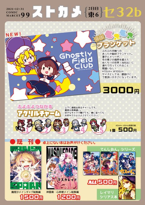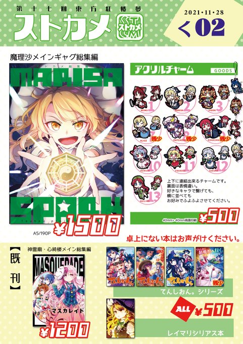 博麗神社例大祭、おしながきになります! 「旅路の果て」は「幻葬に至る旅路」の後日談。完売後はWEB上でデータ公開予定です。 アクスタはBOOTHにて予約受付中!不参加の方、ぜひご利用ください。 stcm.booth.pm 他、グッズ、既刊共に持ち込みます。「あ20b:ストカメ」にてお待ちしてます!