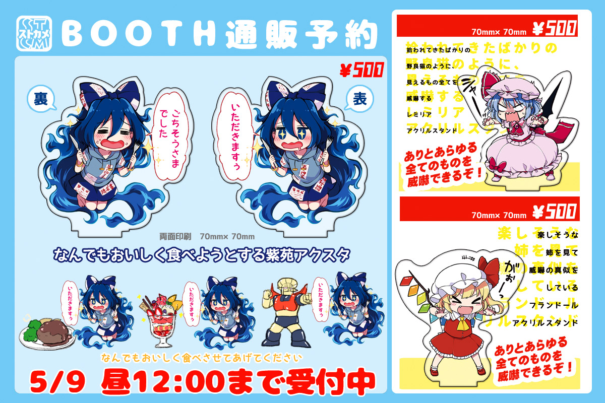 5/8の例大祭合わせでアクスタ再販します! それに伴い、BOOTHにて受注予約をしますので是非ご利用ください。 受付期間は、例大祭翌日の5/9昼12:00まで。発送は6月上旬を予定しています。今回が最後の再販になりますので、欲しい方は期間内にご注文よろしくおねがいします! stcm.booth.pm