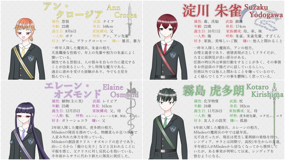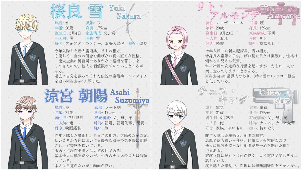 #3月になったのでフォロワーさんに自己紹介しようぜ #Mileden_for_Peace_and_Atonement (略称 #Mileden 、 #みーでん )というノベルゲームを作っています! 魔術兵として闘いながら相方や友達、家族の絆を紡いでいく物語です✨ 相関図と人物紹介(リプに続く)を置いておきます