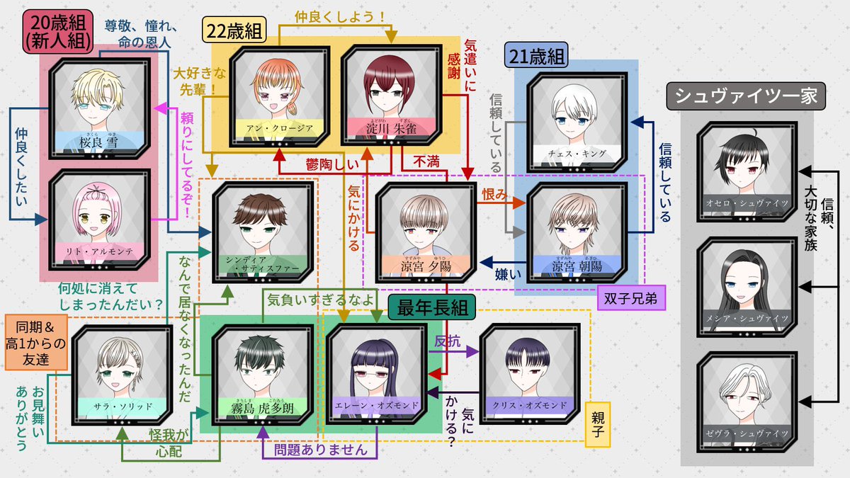 #初夏の創作クラスタフォロー祭り #自創作に狂っている人間と繋がりたい #Mileden_for_Peace_and_Atonement (略称 #Mileden 、 #みーでん )というノベルゲームを作っています! 魔術兵として闘いながら相方や友達、家族の絆を紡いでいく物語です✨ 相関図と人物紹介(リプに続く)を置いておきます