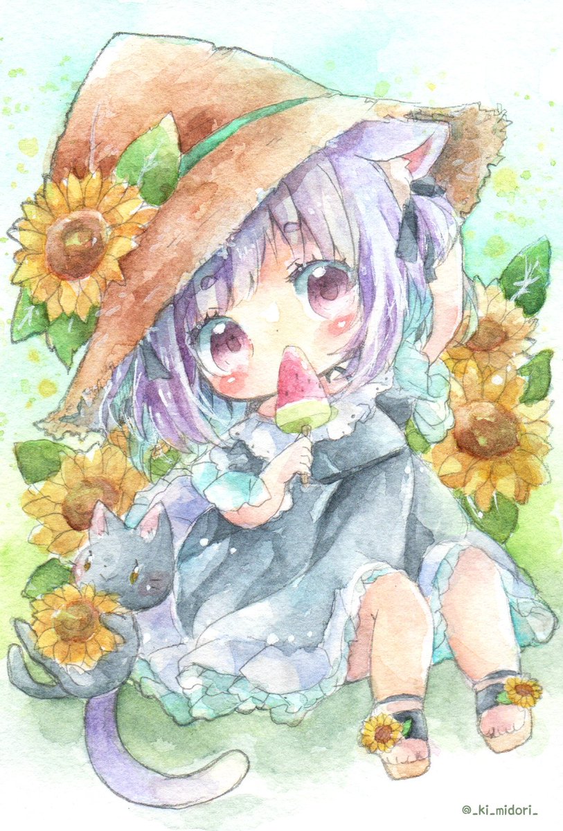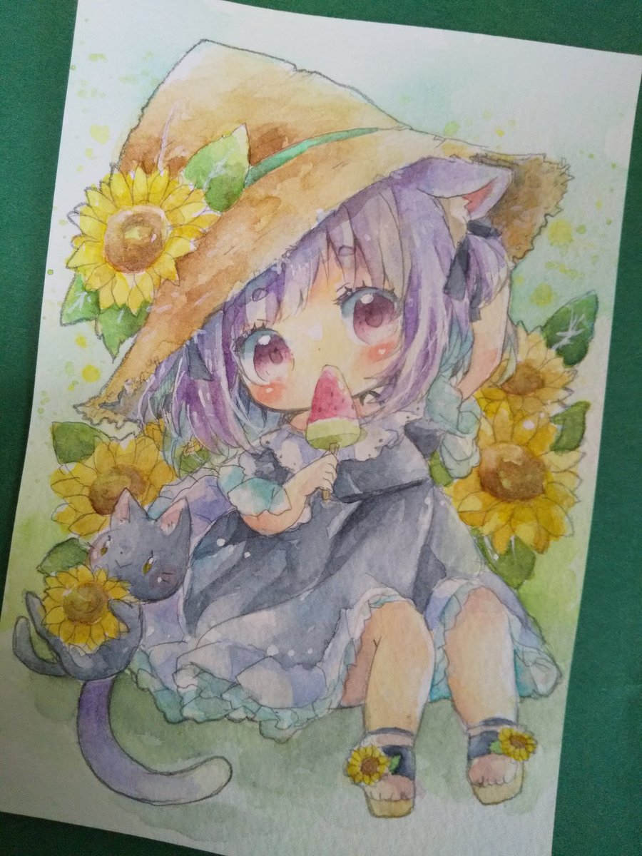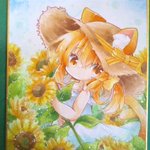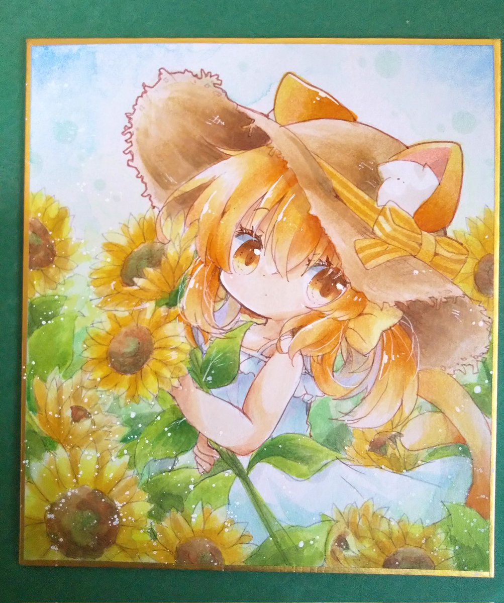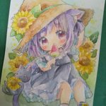 おわ。だいぶ前に描いた向日葵と橙猫ちゃんの絵が残ってたー この頃のが紙のサイズも大きかったのよね… なつかし… これはこれで可愛い…と思う
