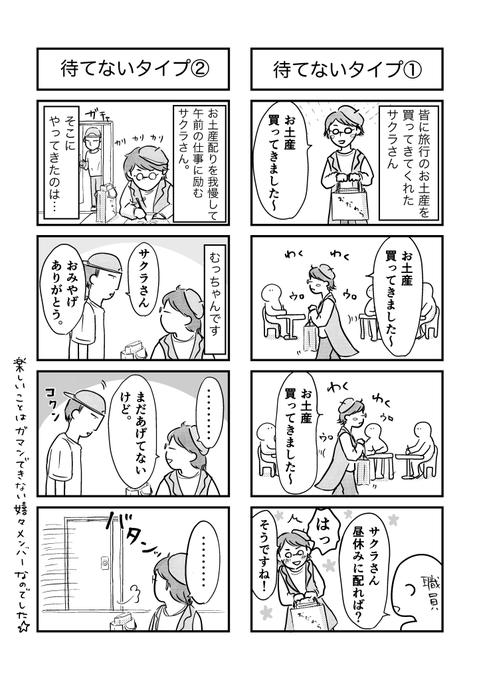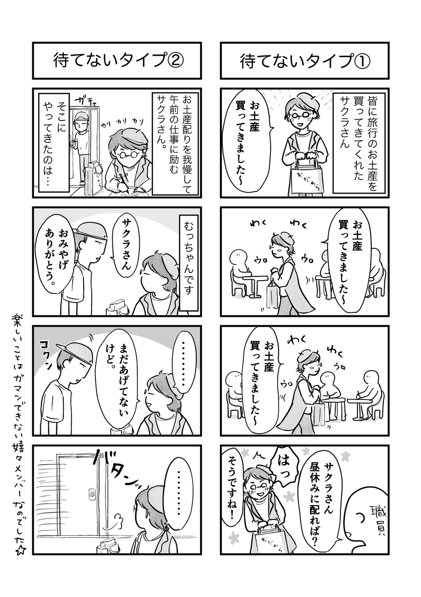 【キキの嬉々!!な日常】① 突然ですが、嬉々メンバーの楽しい日常を漫画でお届けします! 今回登場するのはシックな作品が大人気のサクラさんと、村松石油でお馴染みのむっちゃん。 連休明け、皆にお土産を買ってきてくれたサクラさんでしたが… #漫画が読めるハッシュタグ