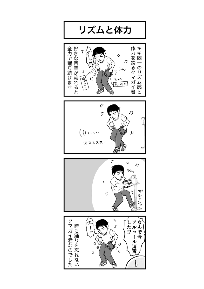 【キキの嬉々!!な日常】③ 嬉々メンバーの楽しい日常をお届けする漫画シリーズ! 音楽大好きクマガイさん、ダンス中にまさかの…。 (コメント欄に動画もありますので是非ご覧ください!) #漫画が読めるハッシュタグ